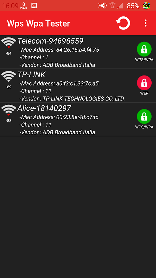 1. Launch this app and tap on the refresh button. If this app shows green icon on your wifi name, that means this app can hack wifi password. Select Green Signal WiFi and move to next steps.